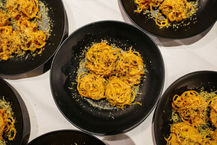 On-demand vegetable varieties also give chefs a chance to approach ingredients they might have used tens of thousands of times before, and reimagine the attributes they can highlight in a given dish. Take, for example, the so-called Badger Flame beets, which, according to Row 7, “contain all the vegetal sweetness of the beet, without the polarizing earthiness.” Suddenly, a chef can amplify a beet’s rawness, the very quality they usually want to mask. Chef Puglisi’s solution at the Row 7 dinner was spiralized raw-beet noodles (like zoodles, but beets) finished with that elderflower-spiked egg-yolk sauce. The effect of the elderflower vinegar was undeniable, drawing out bright floral notes in the beet that would have been severely diminished by cooking.